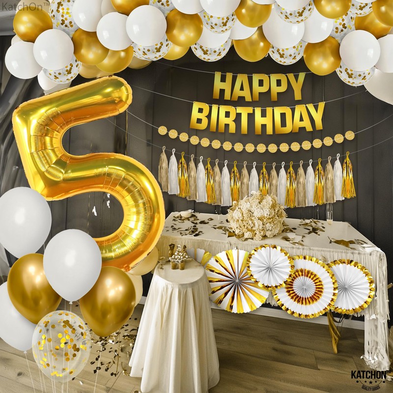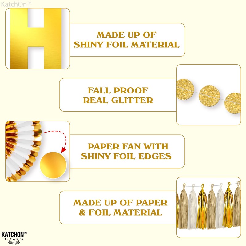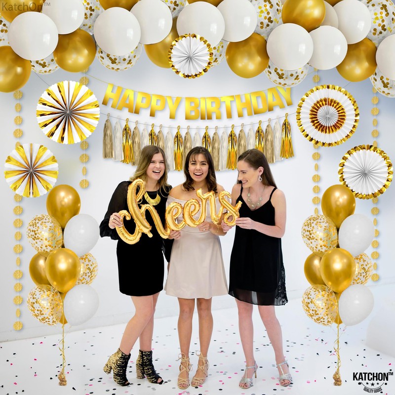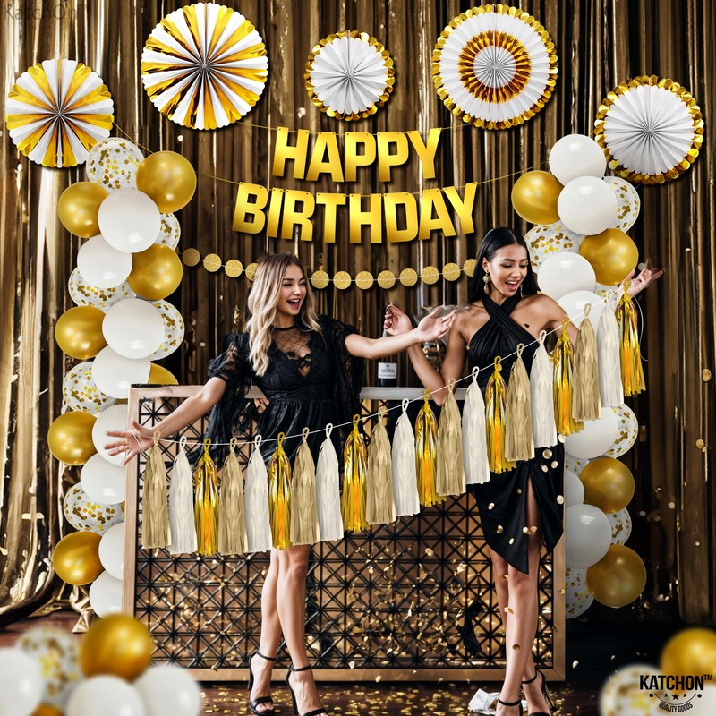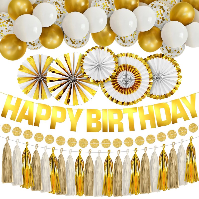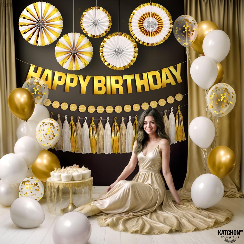 - PACK OF 31 | ALL IN ONE GOLD BIRTHDAY DECORATIONS SET : Be it indoor/outdoor happy birthday decorations for women, this large gold balloons birthday decoration set with gold happy birthday banner, gold, white and confetti latex balloons, paper fans gold dot garland and paper tassel garland. All that you need to decorate your party & impress guests. This Gold Birthday Party Decorations kit or gold party decorations have been used for all kinds of parties and special occasions.