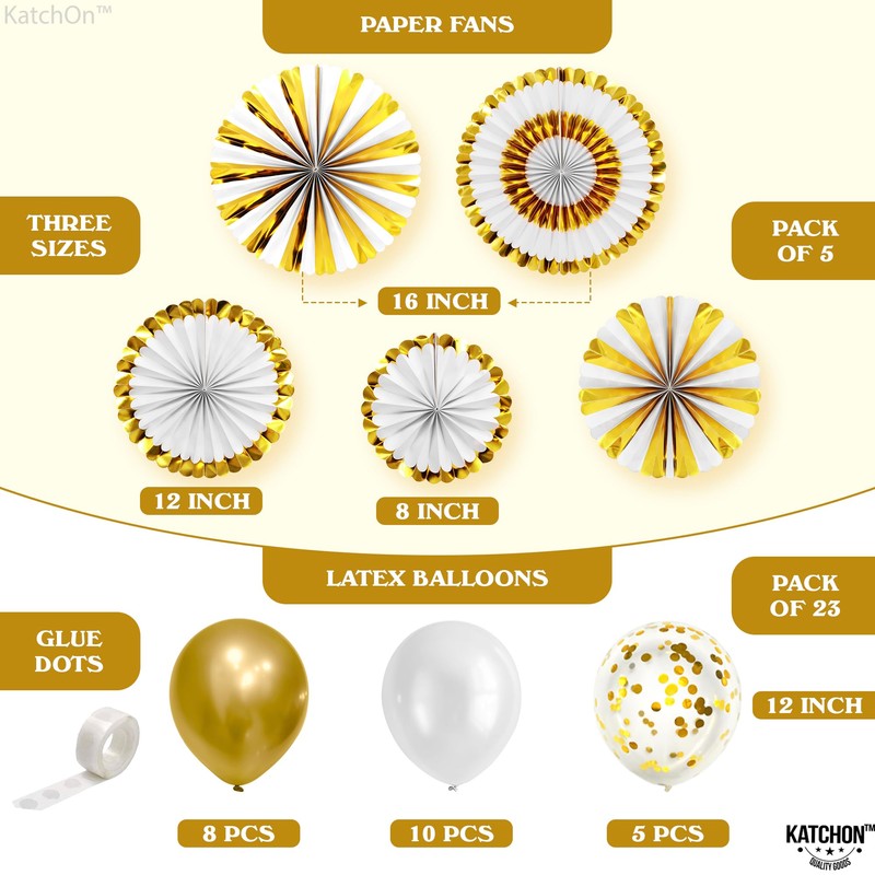- COMPLETE PACKAGE GOLD HAPPY BIRTHDAY BANNER SET: The package include Paper Fan - Pack of 5, (16 Inch - 2pcs, 12 Inch - 2pcs amd 8 Inch, 1pcs), happy birthday Gold Dot Garland - Pack of 1, Gold Happy Birthfday Banner - Pack of 1 Pre-Strung, Gold Chrome Balloons - 12 Inch, Pack of 8, White Latex Balloons - 12 Inch Pack of 10, Gold Confetti Balloons - 5pc, 12Inch, Paper Tassel Garland - Pack of 1 and 1 Glue Dot. Perfect gold birthday balloons set for golden birthday party decorations