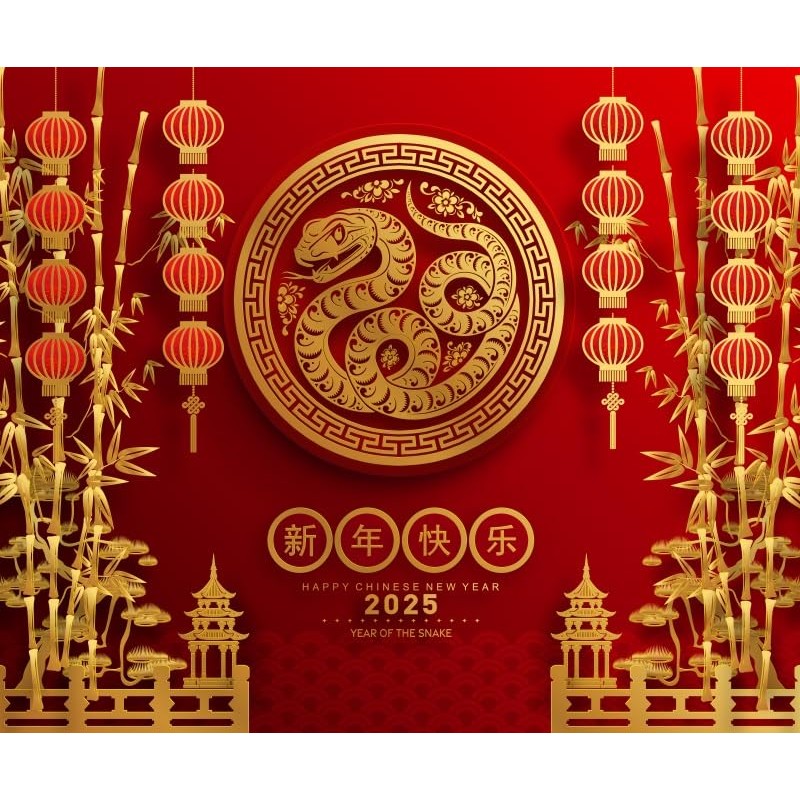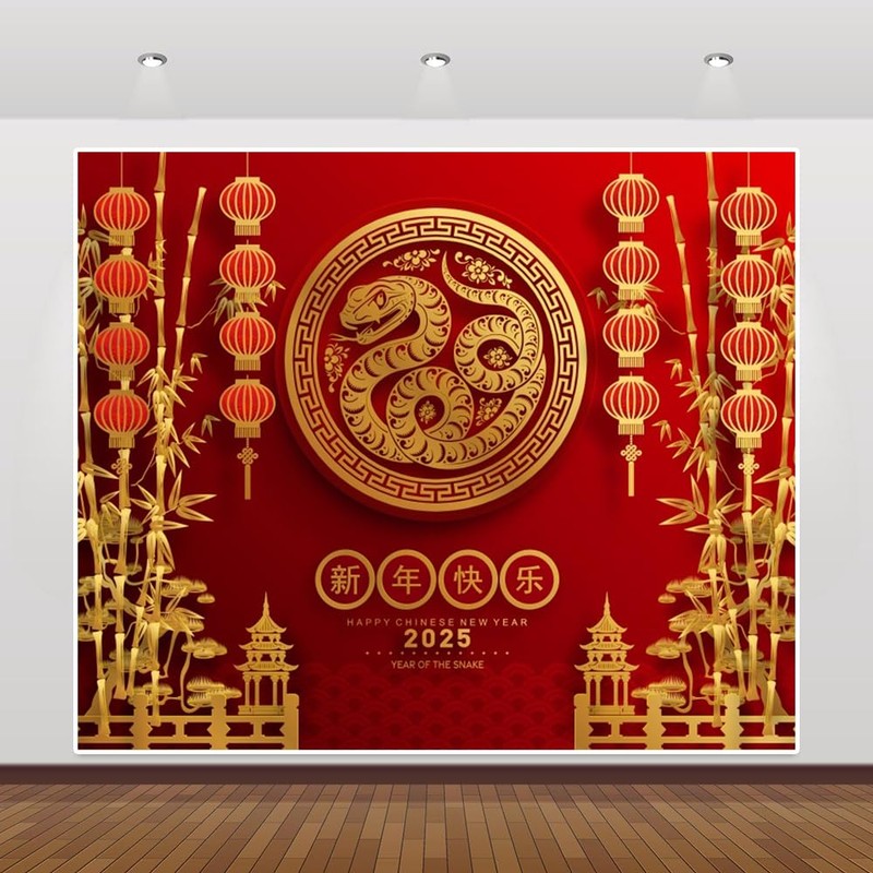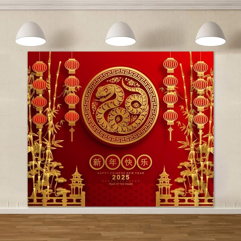Happy Chinese New Year Backdrop 10x8ft Vinyl 2025 Spring Festival of The Snake Backdrops for Photoshoot Paper-Cut Snake Bamboo Lantern Photography Backdrop New Year Party Background Banner Props