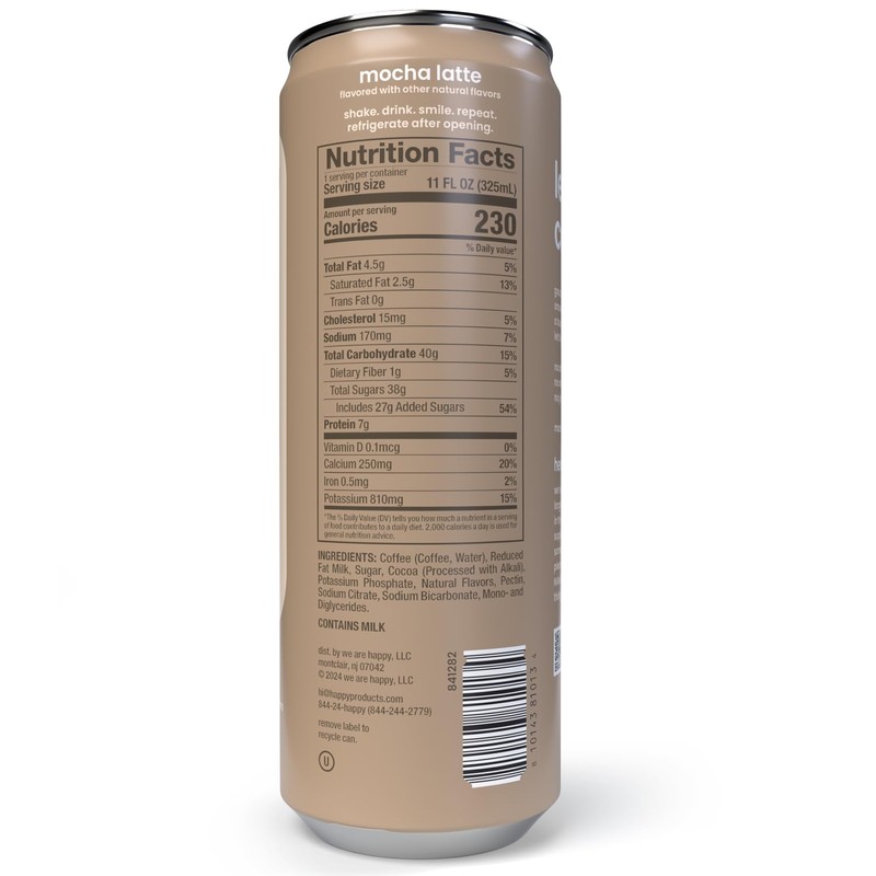 happy coffee canned mocha latte, 11 oz. cans, 12 pack, notes of cocoa & elation, 100% arabica beans, no artificial flavors or sweeteners