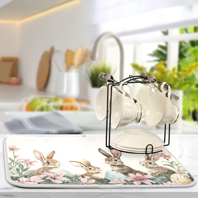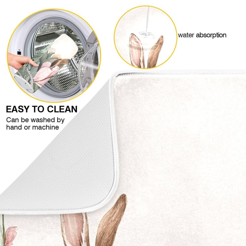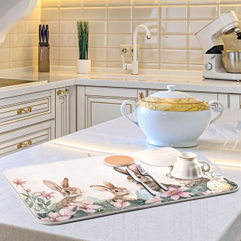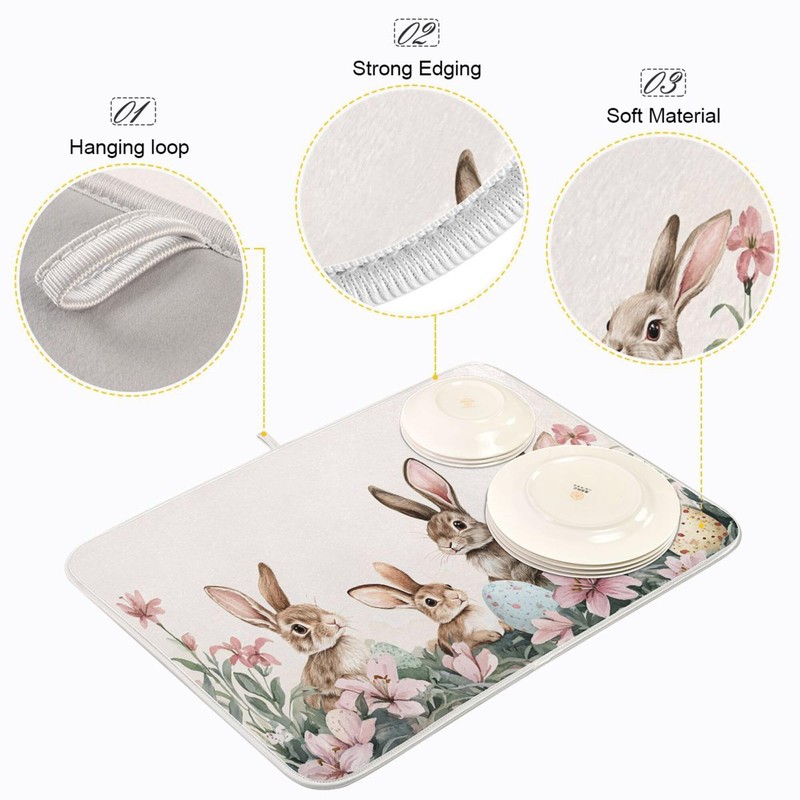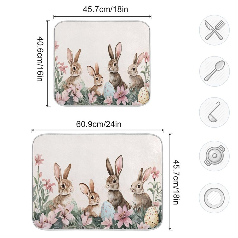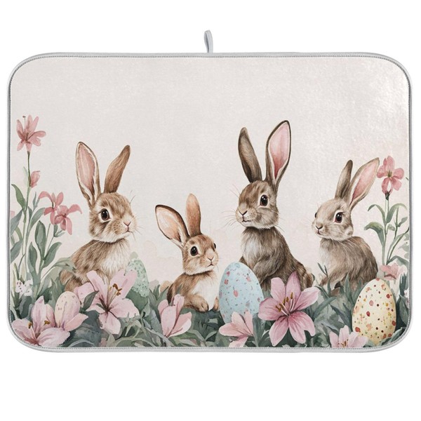 Happy Easter Day Pink Dish Drying Mat Quick Absorbent 16x18 Easter Bunny Rabbit Eggs Butterfly Lily Flowers Kitchen Drying Mat for Countertop Sink Reusable Dishes Mats Kitchen Essentials