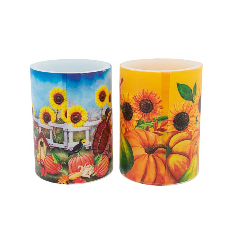 Happy Fall Decorative Flameless 4-Inch Pillar Candles, Set of 2