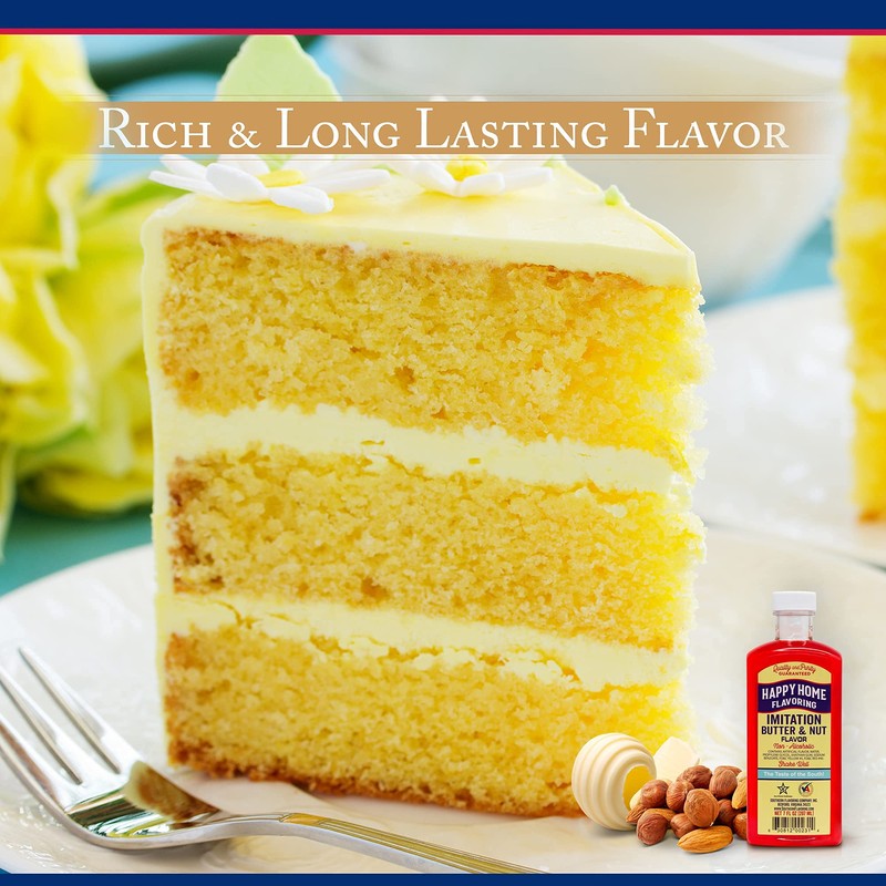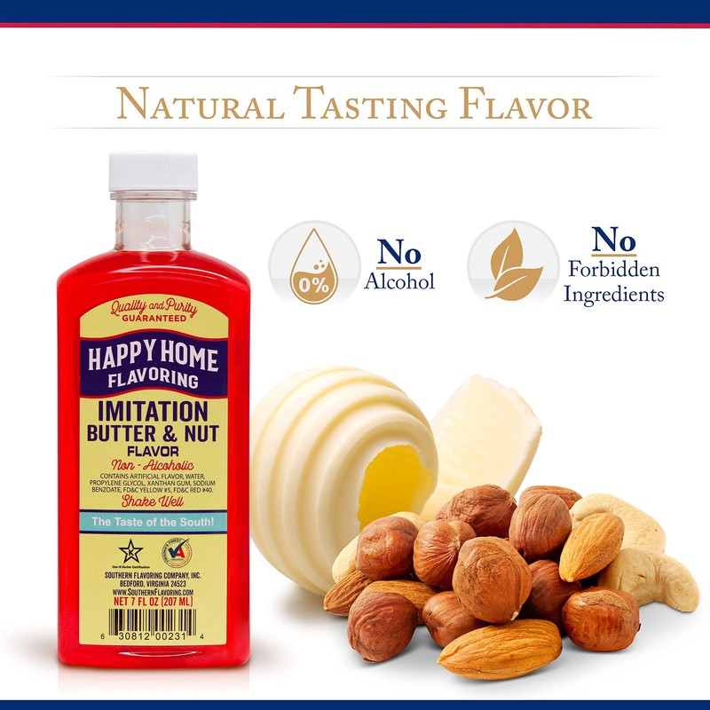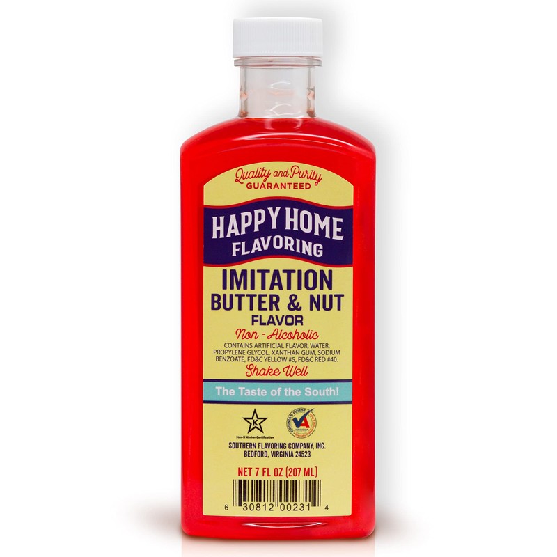 - HAPPY HOME IMITATION BUTTER & NUT FLAVORING – If you enjoy the salty and smooth flavor butter and the rich and savory flavor of nuts, then you’ll love Happy Home’s non-alcoholic Imitation Butter & Nut Flavoring. Comes in an 7 oz. bottle.