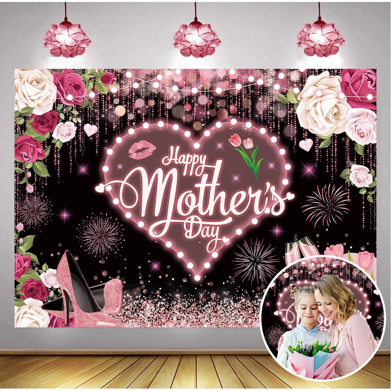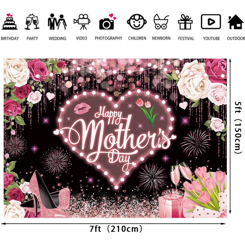 Happy Mother's Day Backdrop 7x5FT Pink Flowers Love Heart Thanks Mother Banner Background Mothers Day Party Decorations Supplies Photo Props