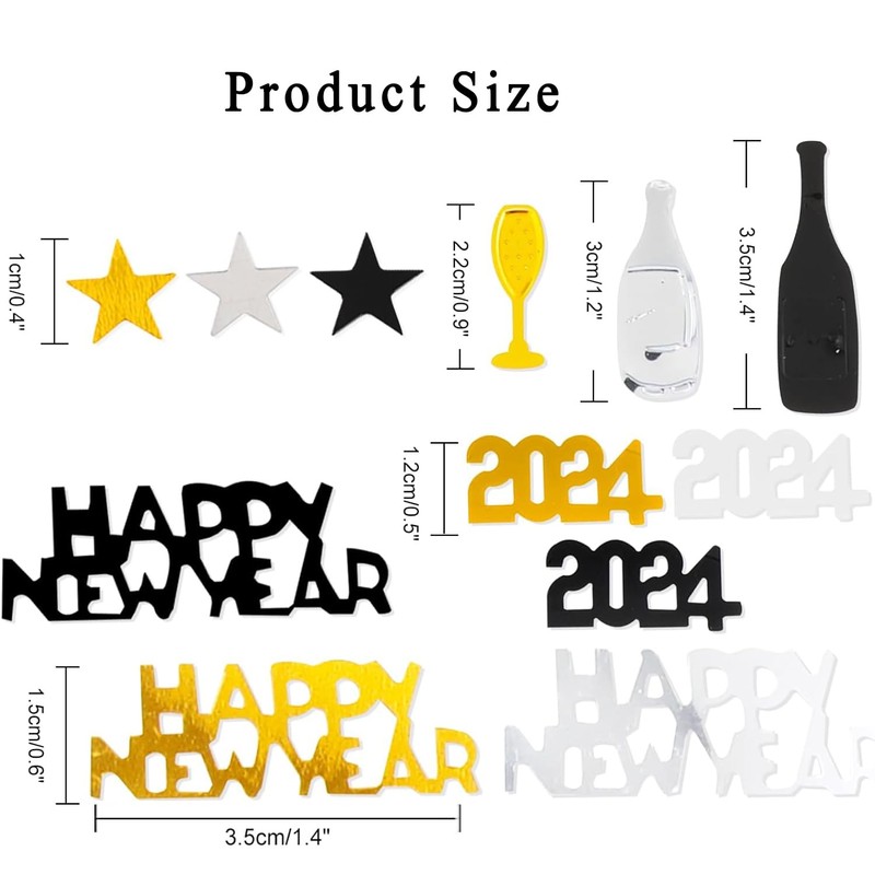 - High Quality Material: New year 2024 confetti made of quality foil. Shiny Black and Gold 2024 confetti no smell and non toxic, cab be scatter on table display, make your new year eve dinner look more shiny!