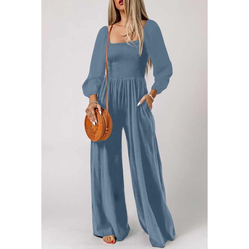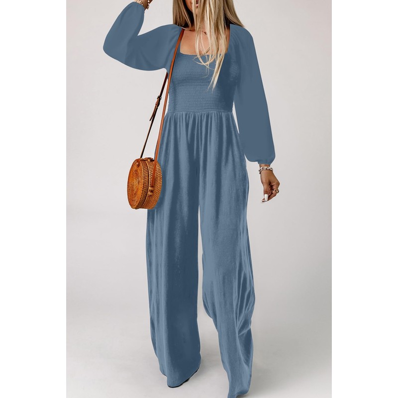 - Feature: One piece jumpsuits for women with long sleeve, square neck, smocked, two side pockets, loose fit, solid color designs, long pants romper, wide leg jumpsuit, casual jumpsuits for women.