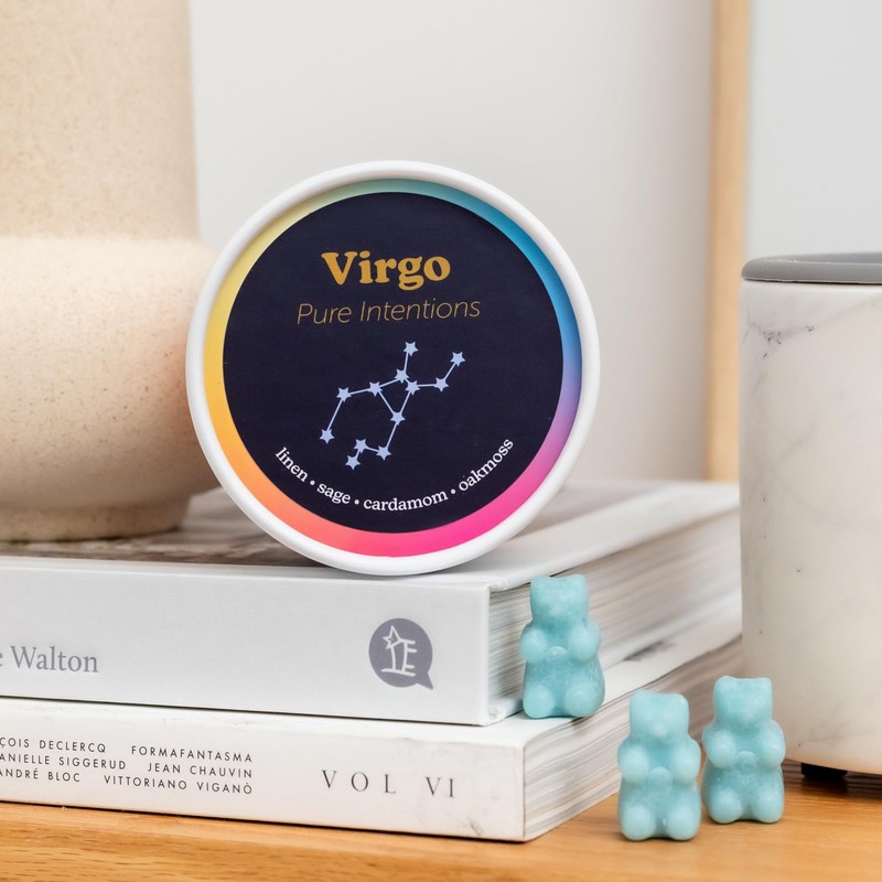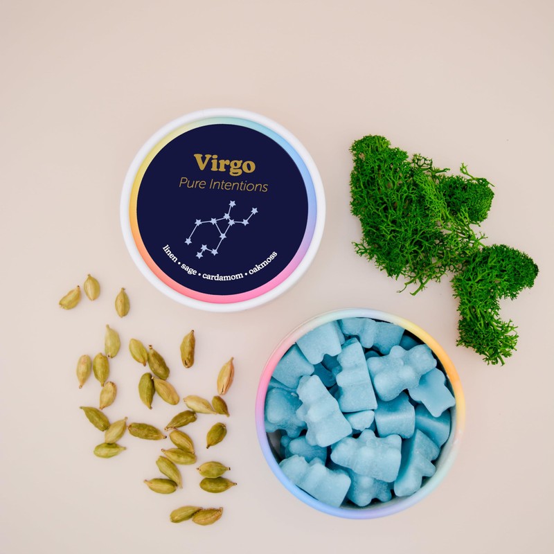 - VIRGO ZODIAC SCENTED WAX MELTS: Pure Intentions (August 23 - September 22) The go-to scent for Virgo babies! The refreshing essence of linen blends with herbaceous sage, warm cardamom, and deep oakmoss for a calming and balanced fragrance. Made with all-natural soy wax, infused with essential oils