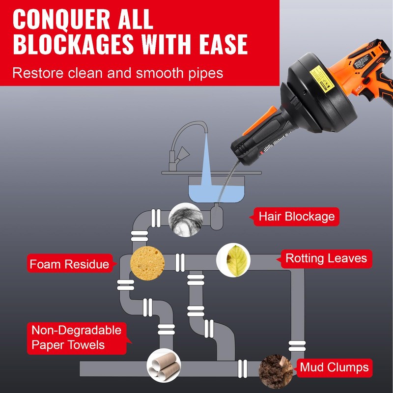 • Versatile & Professional Use: The Happybuy electric drain cleaner is ideal for both residential and commercial use. It effectively clears blockages in pipes from 3/4" to 2", making it perfect for sinks, showers, toilets, and outdoor drains.