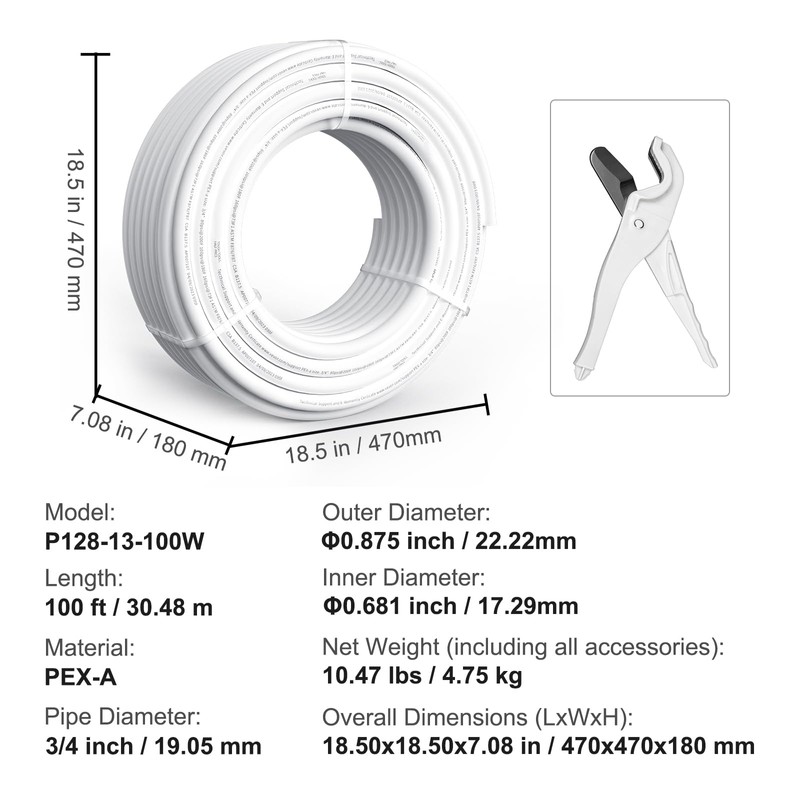 Happybuy PEX Pipe 3/4 Inch, 100FT Length PEX-A Flexible Tubing for Potable Water, Hot/Cold Water Lines, Plumbing Applications, Includes Cutter, White