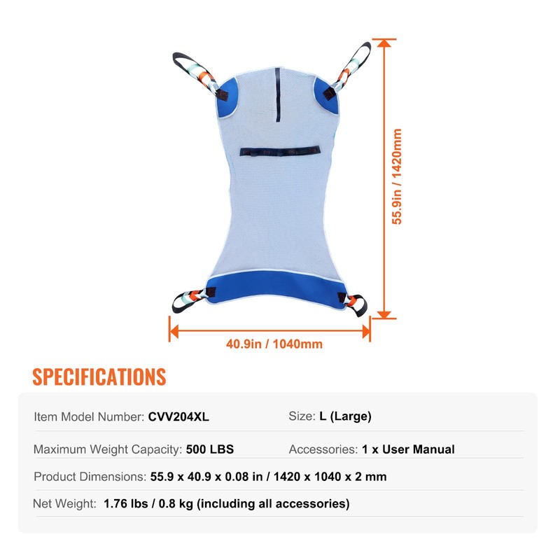 - Ideal for Various Care Needs: Whether you're caring for elderly, bariatric, disabled, or bedridden patients, this full-body sling provides essential support. It’s perfect for post-surgery recovery or ongoing care, offering comfort and stability during transfers.
