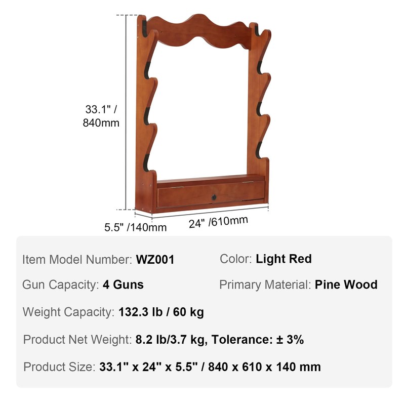 - 4 - Slot Ample Storage with Added Compartment:Measuring 33.1""x24""x5.5""/840x610x140 mm, this gun rack offers space for 4 shotguns, rifles, or various firearms. It also features a lockable compartment, catering to diverse storage needs. With a weight capacity of up to 132.3 lbs, it serves as a reliable storage and display solution.