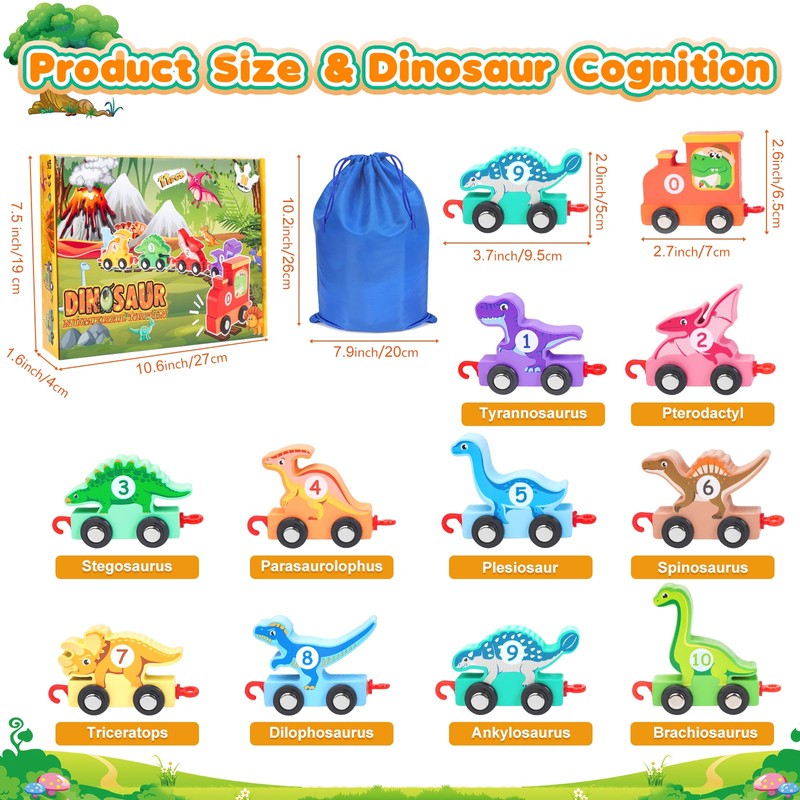 - 【Dinosaur Train Set - 11PCS】Cute dinosaur shaped trains are here! Our wooden train set includes a locomotive and 10 dinosaur train cars with a dinosaur print on both sides and the numbers 0-10.