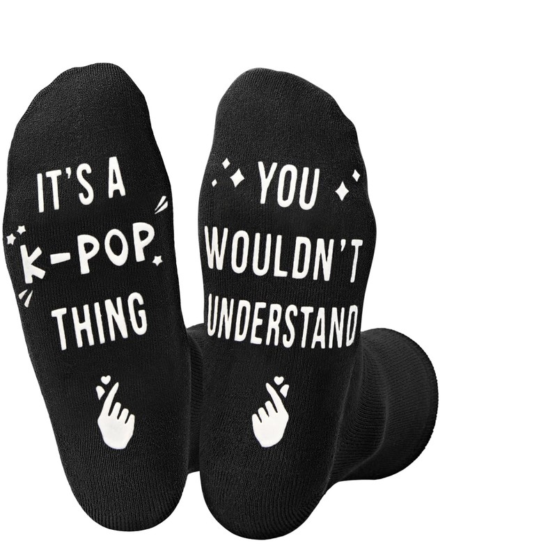 - KPOP GIFTS: Scouting for the perfect gift for someone who loves K-pop? These playful K-pop socks for female fans feature a cheeky declaration that says "IT'S A K-POP THING—NO EXPLANATION NEEDED!" Perfect for gifting to your favorite K-pop stan!