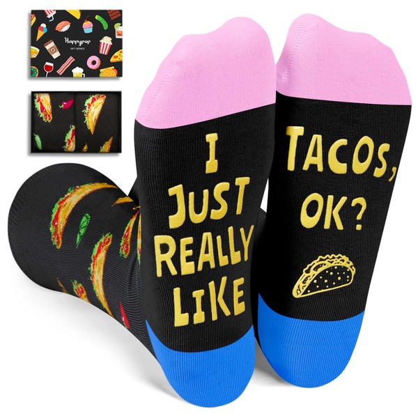 - TACO SOCKS: Taco socks for men and women. With the cute design of tacos and peppers at the top, these black food socks have a funny saying "I JUST REALLY LIKE TACOS, OK?" at the bottom.