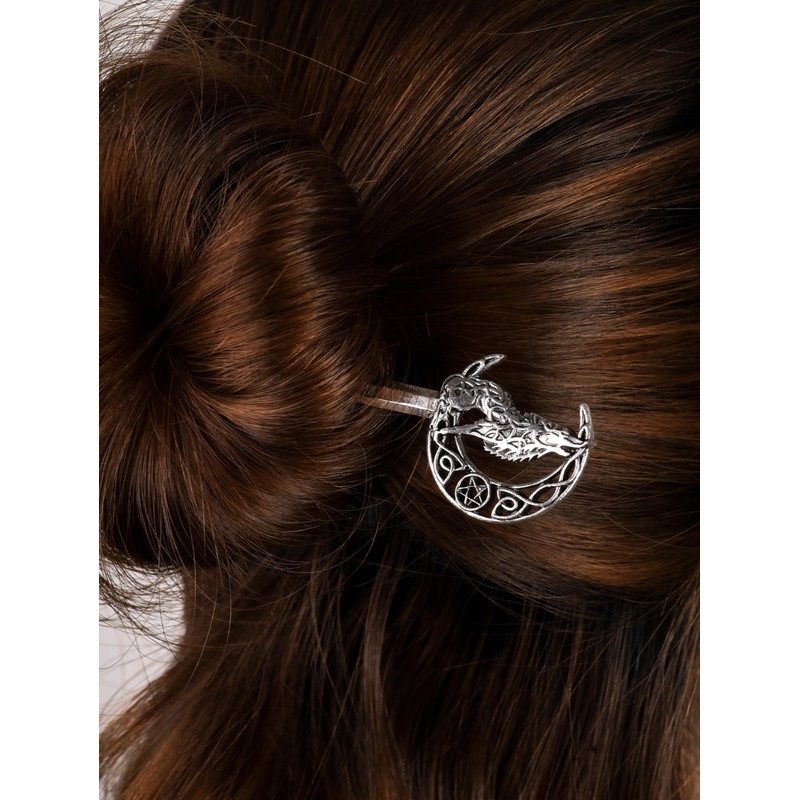 - LOBO CRESCENTE LUNA HAIRSTICK: Este diseño cuenta con una luna creciente adornado con una filigrana y Pentáculo y un lobo aullando celta adornado. El complemento perfecto para tu estética bruja y gótica.