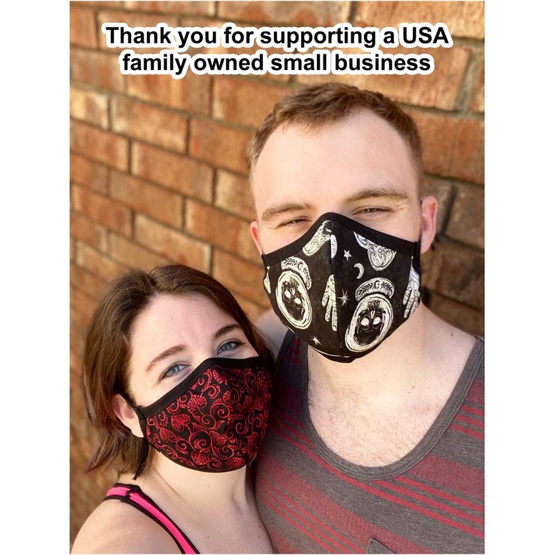 Stylish and Practical! Lined with soft ringspun t-shirt cotton and held in place with adjustable soft touch spandex, these masks are meant to be comfortable for all day wear. They are fully wired across the top to keep the mask in place, perfect for those who wear glasses. The extra soft and stretchy loops are easy on the ears, and the silicone toggles are easy to adjust. Both the soft t-shirt lining and the tightly woven cotton and wick-away binding are perfect to keep your face dry even in the heat or during exercise. Due to the wire these masks must be either hand washed, or washed on the delicate cycle of your washing machine with a delicates bag. Wash in cold water and tie the elastics firmly before washing. Hang to dry. Please note, do not use fabric softener on face masks. It can make the masks harder to breathe in. This mask is not intended for medical use, and not proven to reduce the transmission of disease.