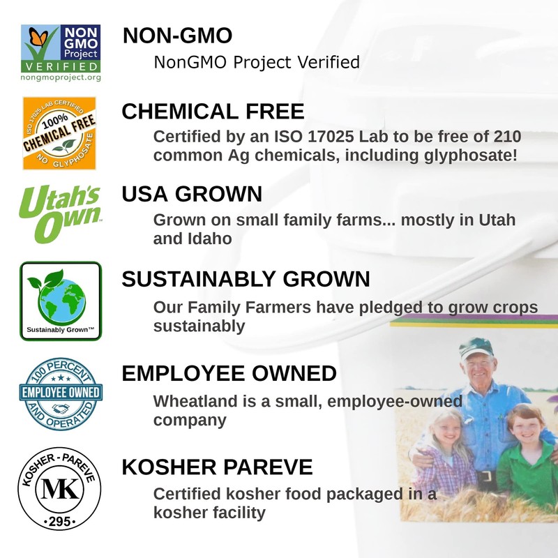 - CHEMICAL-FREE: Many farmers use chemical herbicides and fungicides to reduce growing costs and increase yields...so we test all our products at an ISO 17025 lab to verify they are pure and free of any chemical residue, desiccant or glyphosate. Wheatland is the only major seller of long term food storage that tests for 210 common agricultural chemicals; providing you the peace of mind knowing your food is pure and chemical free.