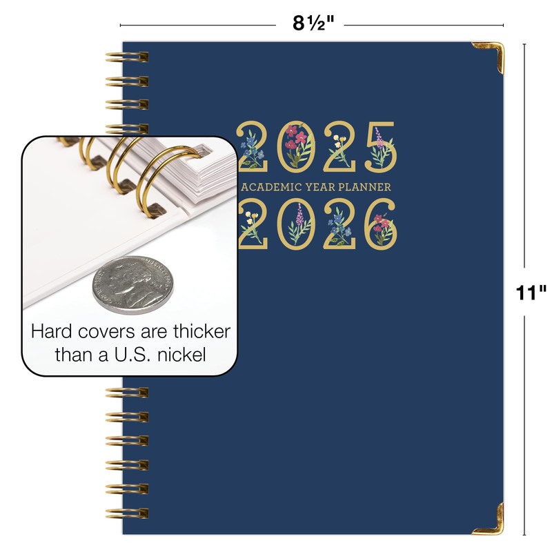 HARDCOVER Academic Year 2025-2026 Planner: (June 2025 Through July 2026) 8.5"x11" Daily Weekly Monthly Planner Yearly Agenda. Bookmark, Pocket Folder and Sticky Note Set (Navy Gold Numbers)