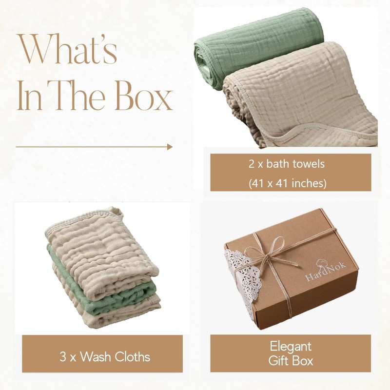 HardNok Muslin Baby Bath Towel Set, 2 Large Gauze Super Soft Baby Bath Towel and 3 Washcloths, 6 Layers 100% Cotton Infant Towel Newborn Towel Blanket Suitable for Baby's Delicate Skin (Warm Series)