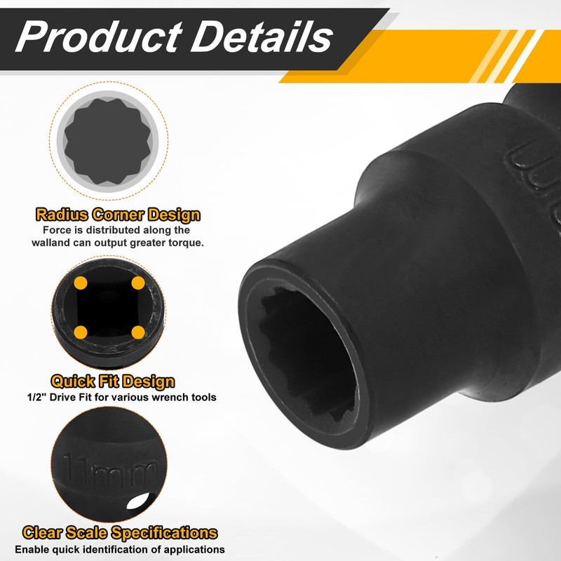 - Size - Square Drive: 1/2"; Metric 12-point Socket: 11mm; Overall Length: 38mm / 1.5". The specifications are marked on the surface of the impact socket for easy identification and improved work efficiency.