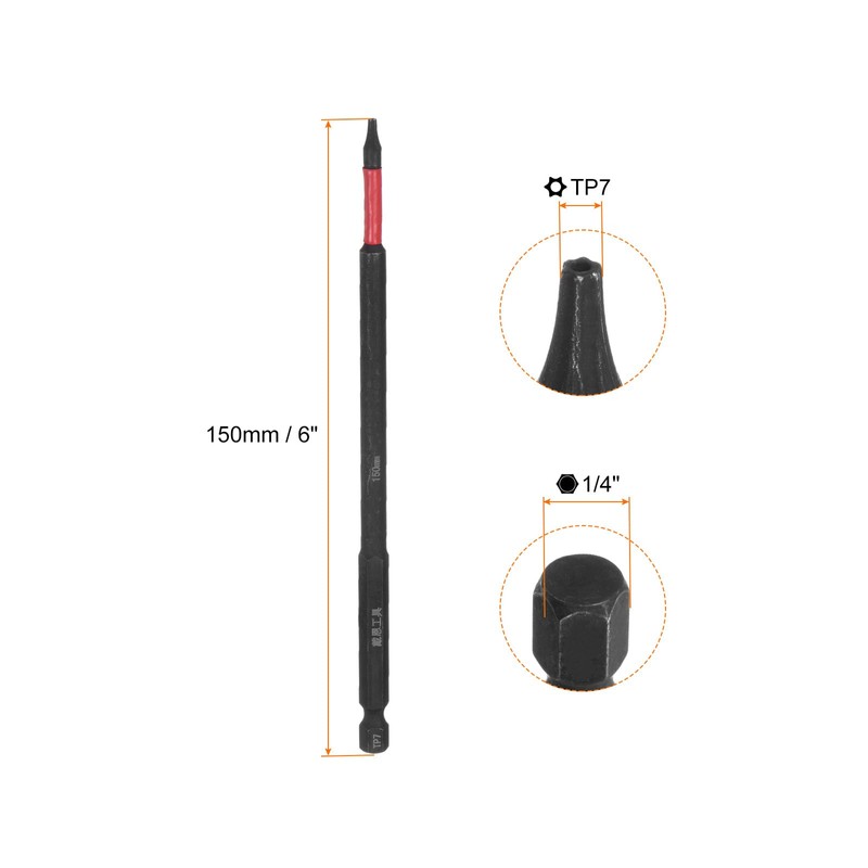 - Size - Type: T7; Total Length: 150mm / 6"; Shank Diameter: 1/4". You will receive 10pcs screwdriver bits in one package.