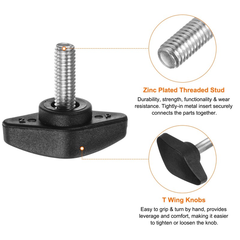 - Features - The tightly-in metal insert are machine-injected at high temperatures to securely connect the parts together, easy to install. T wing knobs are easy to grip and turn by hand, providing leverage and comfort, making it easier to tighten or loosen the knob.