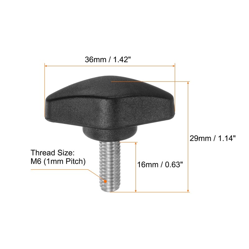 - Size - Standard Thread Size: M6 (1mm Pitch); Thread Length: 16mm / 0.63"; Tee Wing Head Width: 36mm / 1.42"; Total Length: 29mm / 1.14"; Knob Style: Tee; Color: Black ( The threads are neat and clear, the force is even and deep, not easy to slip, and there are no burrs.)