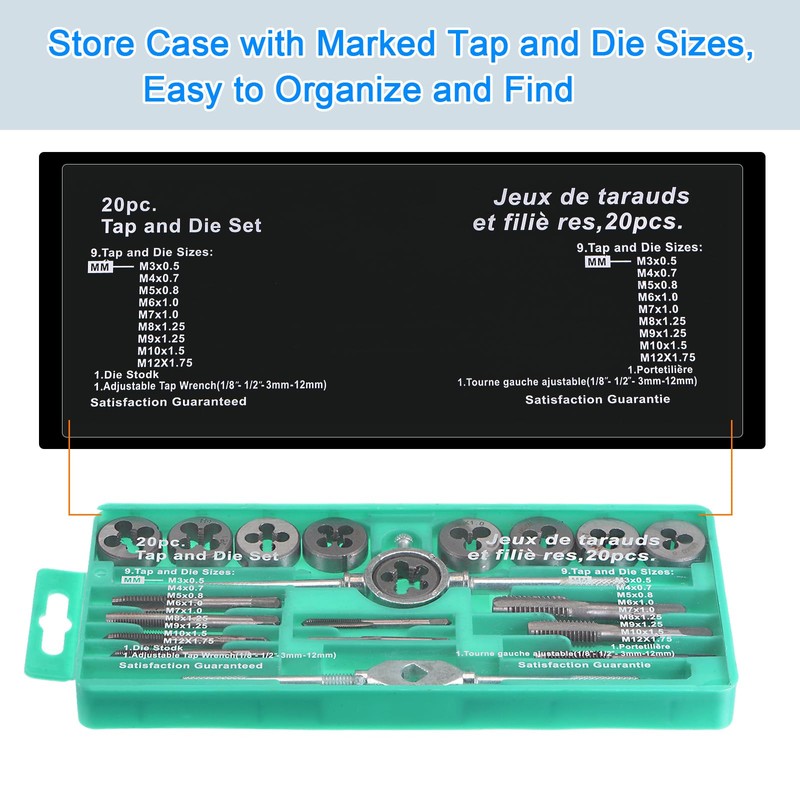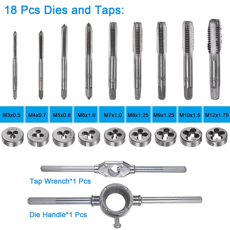 - Metric Tap and Die Set - Contains 18pcs Dies and Taps: M3x0.5, M4x0.7, M5x0.8, M6x1.0, M7x1.0, M8x1.25, M9x1.25, M10x1.5, M12x1.75, 1pcs x Tap Wrench, 1pcs x Die Handle, with a store case.