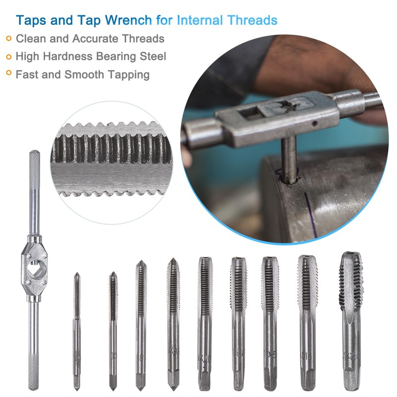 - Complete Set Accessory - Tap and die sets have a wide range of applications across various industries and DIY projects such as repairing plumbing, woodworking, metalworking, etc.. An essential tools for professionals and hobbyists alike.