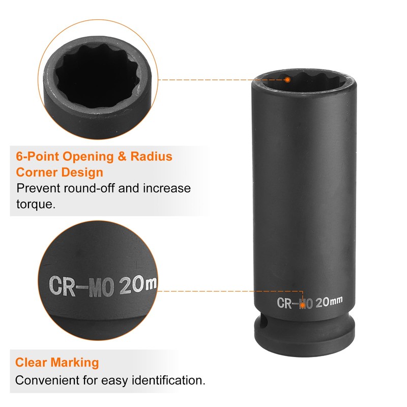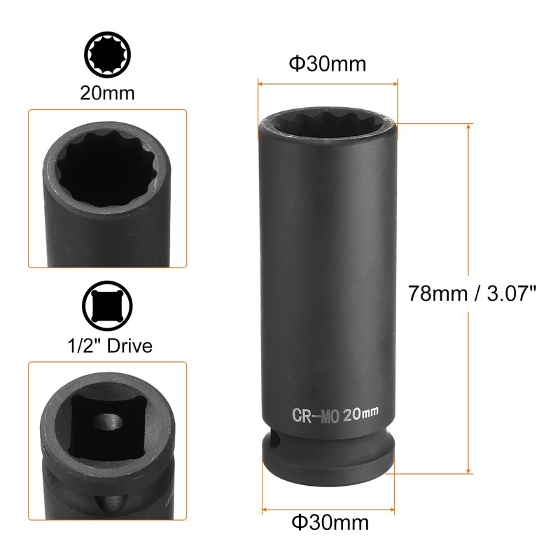 - Size - Drive: 1/2-inch, 12-Point Socket Size: 20mm, Total Length: 78mm / 3.07-inch. The specifications are clearly marked on the surface of the socket, which is easy to identify and improves work efficiency.