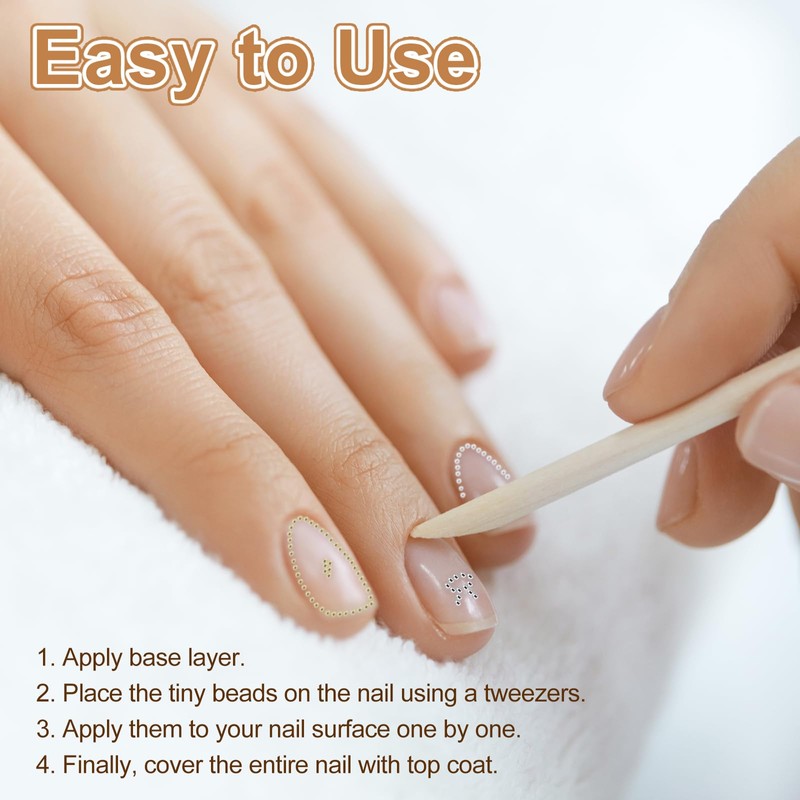 - Features - The nail art beads are suitable for both natural and artificial nails. Simply clean the nail surface, apply adhesive to secure them in place, and complete with a final layer of topcoat to set. The process is easy and suitable for both professionals and beginners alike.