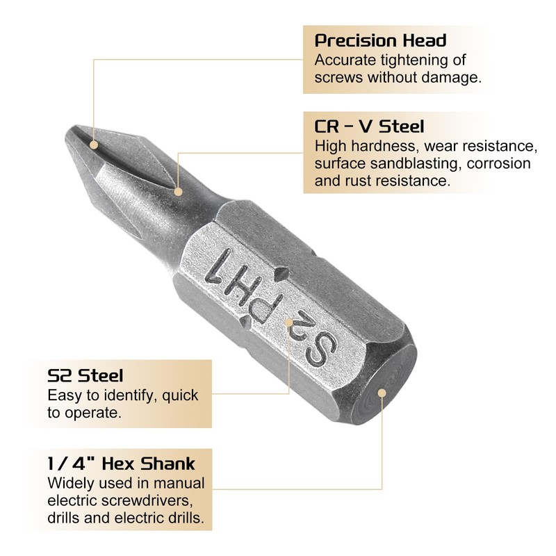 - Size - Bit Type: PH1; Hexagonal Shank: 1/4"; Total Length: 25mm / 1"; The screwdriver bit is exquisitely made, each edge can lock the screws accurately, and will not easily damage the screws and screwdriver heads.