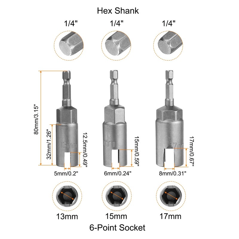 - Size - The Metric 6-point socket size is 13,15,17mm, the hex shank is 1/4", and the overall length is 3.1" (80mm).