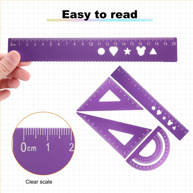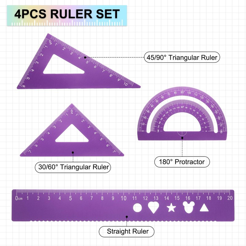 - Package Content - 1pcs straight rulers, 1pcs 30/60 degree triangle rulers, 1pcs 45/90 degree triangle rulers, 1pcs protractors. Different types of rulers can meet different drawing needs and improve measurement and drawing efficiency.