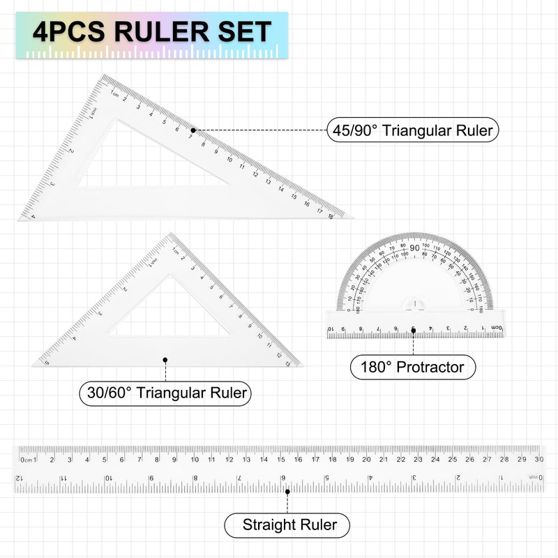 - Package Content - 1pcs straight rulers, 1pcs 30/60 degree triangle rulers, 1pcs 45/90 degree triangle rulers, 1pcs protractors. Different types of rulers can meet different drawing needs and improve measurement and drawing efficiency.