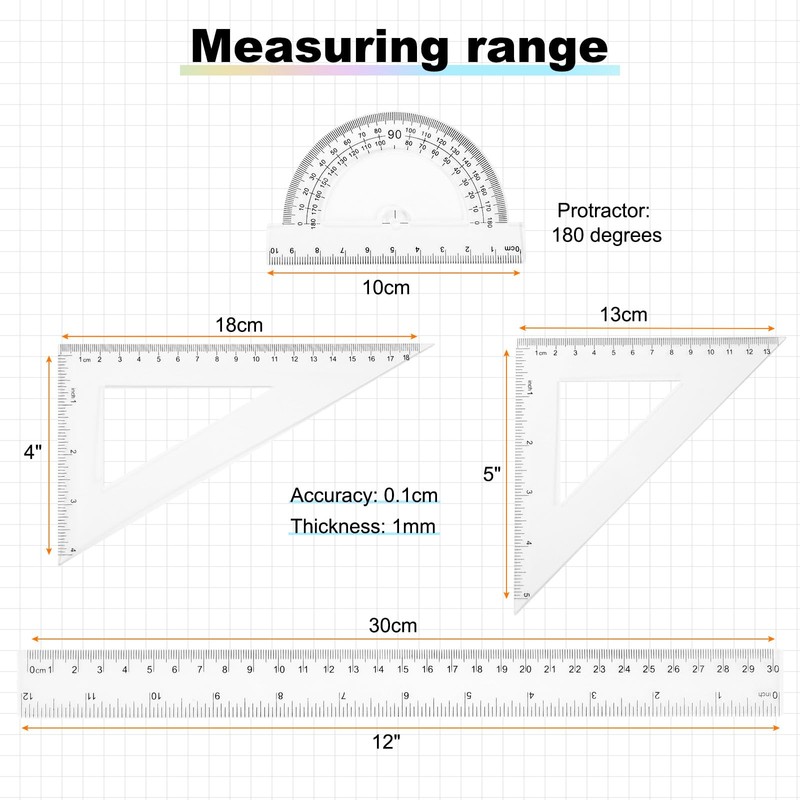 - Size - Ruler range: Straight ruler: 30cm / 12 inch, triangle ruler: 13cm / 3inch, 18cm / 4inch, protractor: 180 degrees, 10cm; accuracy: 0.1cm, thickness: 1mm.