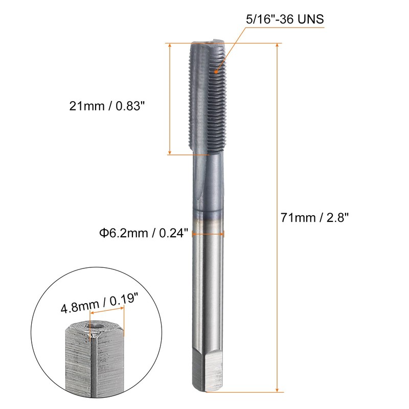 - Size - Thread Size: 5/16"-36 UNS; Shank Diameter: 6.2mm / 0.24"; Flute Length: 21mm / 0.83"; Total Length: 71mm / 2.8"; Square Head: 4.8mm / 0.19"; Flute Style: 3 Straight Flutes; Cutting Direction: Right Hand; Style: Flat Head Plug Tap.
