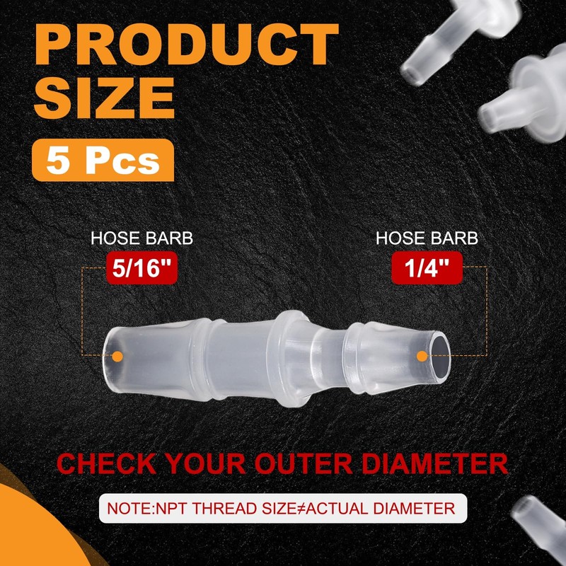- Lightweight And Easy Installation: The 1/4" to 5/16" plastic hose barb adapters design ensures quick, secure connections for hoses, pipes, and pumps. Lightweight PP material simplifies DIY projects (e.g., garden sprinklers, 15D printers) or professional setups like fuel filters and air compressors—no tools required.