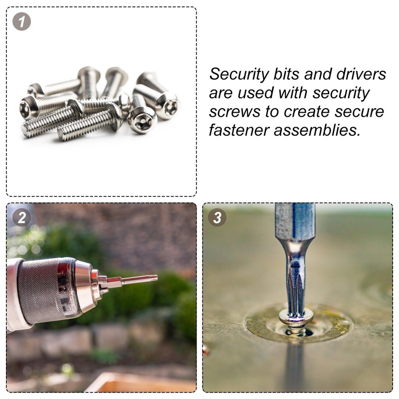 - Feature - Security bits and drivers are used with security screws to create secure fastener assemblies. They can be used anywhere that tampering might be suspected. Such as repairs, interiors, computers, electronics, etc.