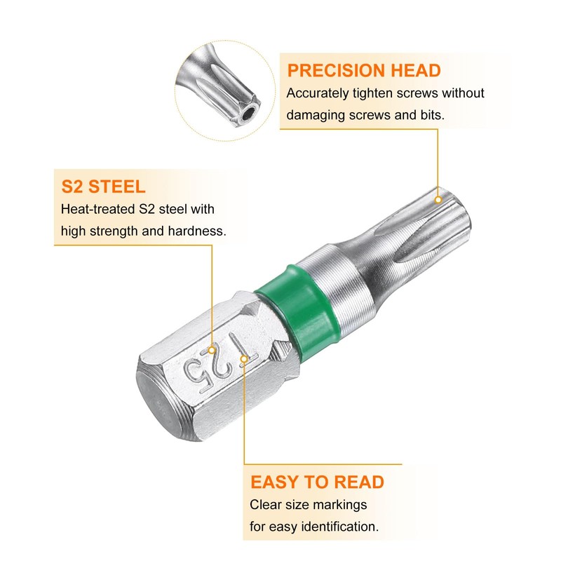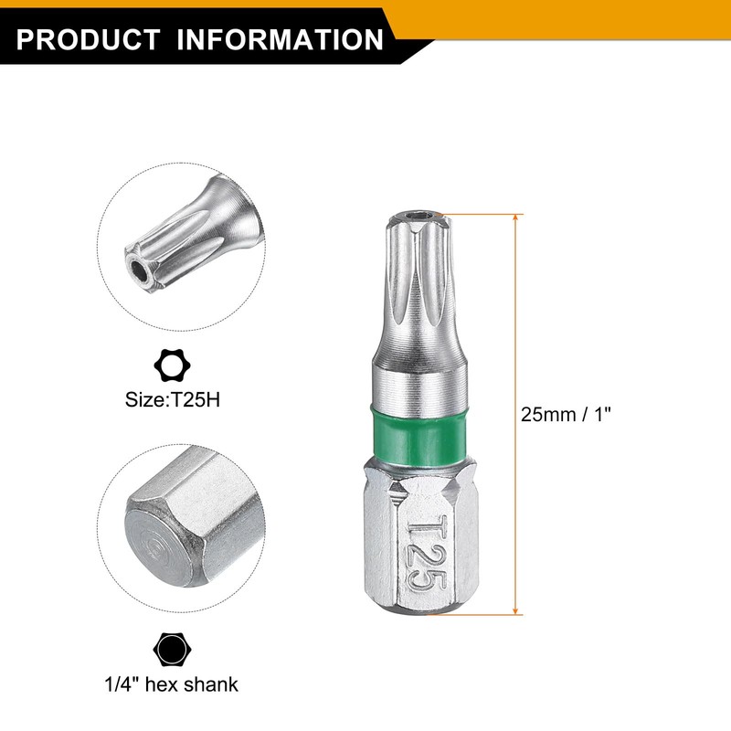 • Size - T25H; Total Length: 25mm / 1"; Torx head drill bit specifically designed for driving screws into wood, metal, and other materials effortlessly. Can accurately tighten screws without damaging screws and screwdriver bits.