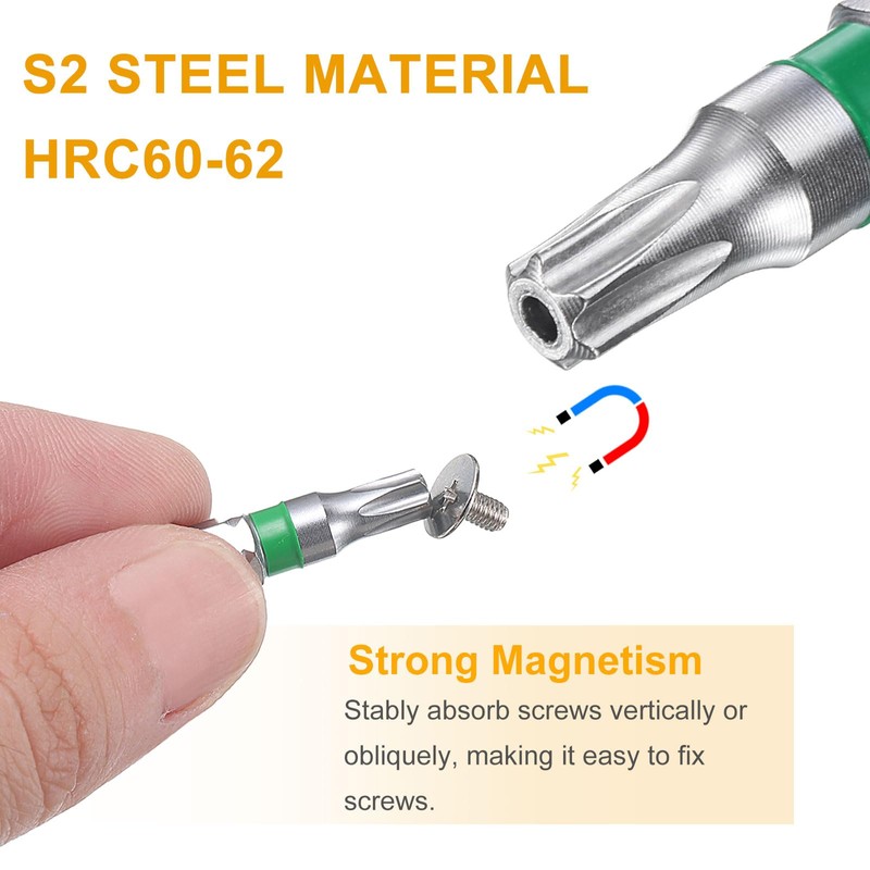 • Material - The screwdriver bits are made of specially heat-treated S2 steel with high strength and hardness (HRC60-62), durable and anti-bending, and the surface is pearl chrome for enhanced grip and corrosion resistance