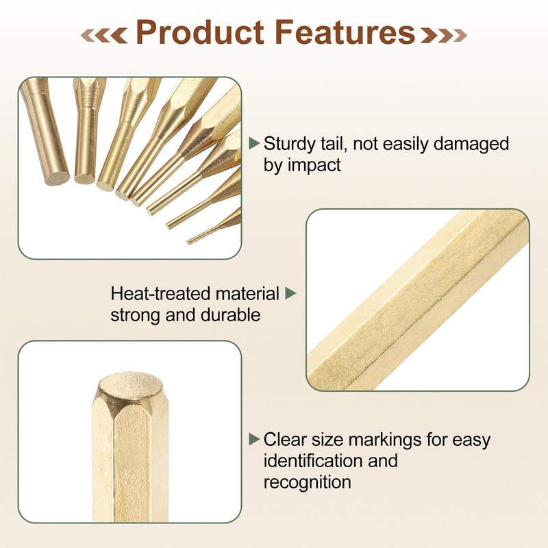 - Material - Pin punches are made of brass material and are heat treated for excellent durability, workability and overall performance. Brass punch sets are great for repairing or maintaining small equipment, machines and vehicles, and can be used to drive pins, watches, bracelets, etc