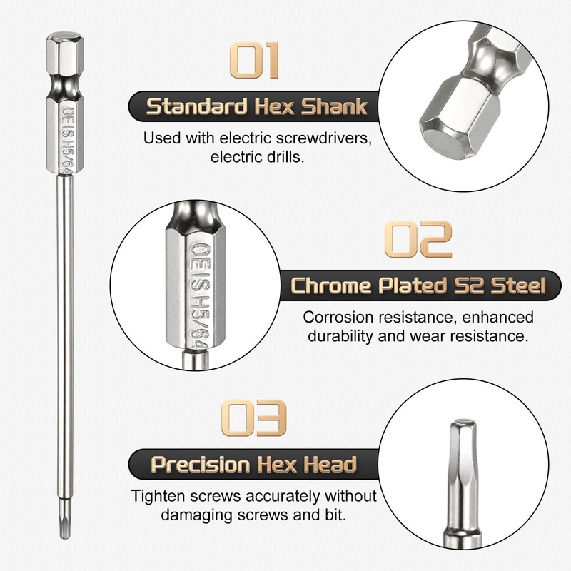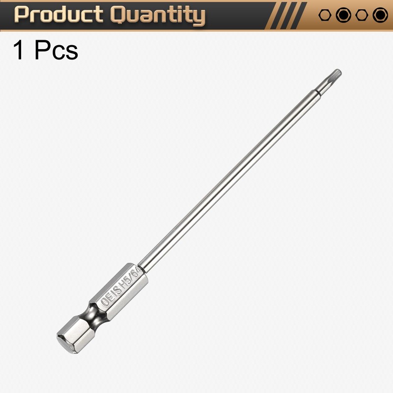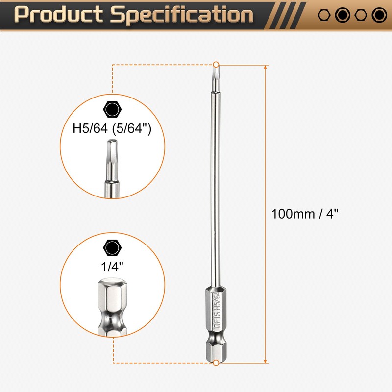 - Size - Flat hex head size: H5/64 (5/64"); hex shank size: 1/4"; overall length: 4" (100mm); hardness: HRC56-58 (The recognized stable hardness is around HRC60.). The H value indicates the size of the hexagonal head.