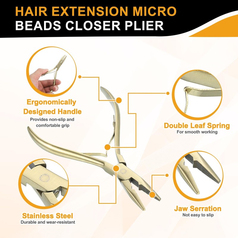 - Material - Hair extension tool set is made of heat-treated stainless steel 3Cr13 with blackened surface. The micro bead hair extension closer pliers are designed to clamp and open micro link beads, while the hair extension remover pliers are mainly used to squeeze into and open loops, both of which are suitable for hair extension micro links, hair tinsel strands, and feather hair applications.