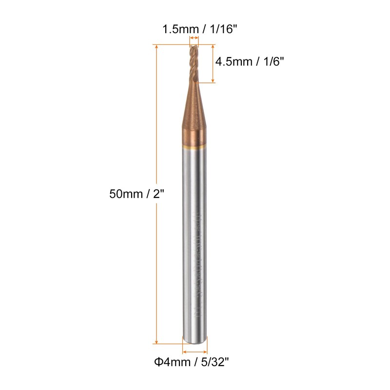 - Size - Cutting diameter: 1.5mm / 1/16"; cutting flute length: 4.5mm / 1/6"; shank diameter: 4mm / 5/32"; overall length: 50mm / 2"; cutting hardness: HRC55; number of flutes: 4 flutes; end cut type: square end