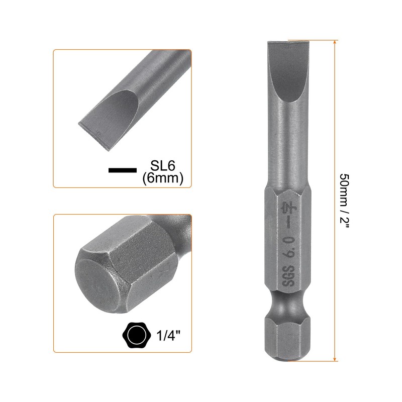 - Size - Magnetic slotted screwdriver bit size: SL2 (6mm), Rod diameter: 6mm / 0.24", Total length: 50mm / 2", Hex Shank: 1/4". Each screwdriver head is clearly engraved with the model for easy identification.