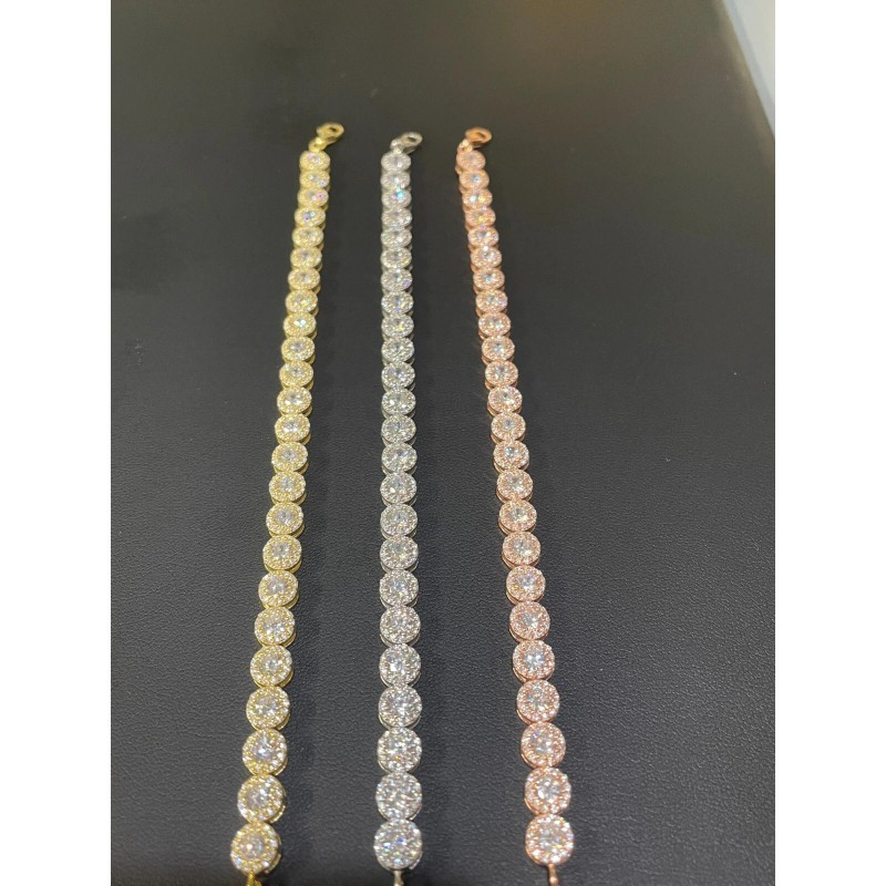 7mm wideSolid 925 sterling silver available in natural silver or 14k yellow or rose gold plated finishStamped 925Color wont change or irritate your skin as its sterling silver underneath (nickel and copper free)Iced with simulated diamonds...look same as natural diamonds but much cheaper!Weighs around 13 grams so very durable and has nice weight to it.7mm wide so very noticeable yet still petite and feminineAdjustable lobster clasp and can fit any hand from 7-8" Ships fastLet us know if any questions