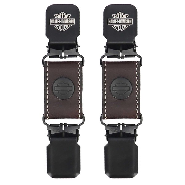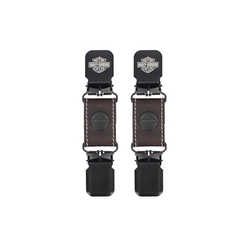 Harley-Davidson Men's Leather Boot Clips – Brown, MAU400/01. Made from genuine pebble leather. Matte black logo clip with laser etched Bar & Shield logo. 1 inch metal clip. Sold as a pair.