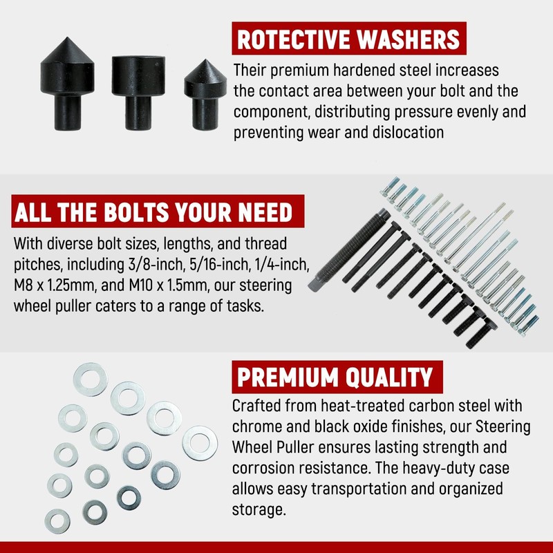 • Expanded Bolt Sizes: With diverse bolt sizes, lengths, and thread pitches, including 3/8-inch, 5/16-inch, 1/4-inch, M8 x 1.25mm, and M10 x 1.5mm, our steering wheel puller caters to a range of tasks.