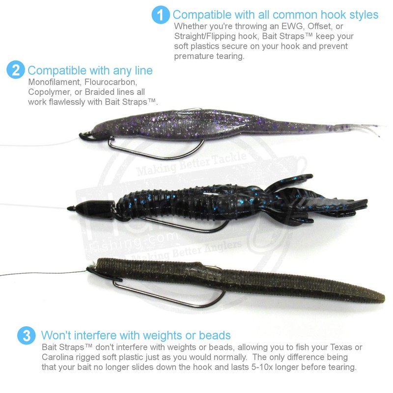 - Keep your soft plastic bait securely in place on your hook. No more sliding down the hook shank or tearing on the hook after catching a fish. Baits last up to 10x longer when using Bait Straps (patent pending).